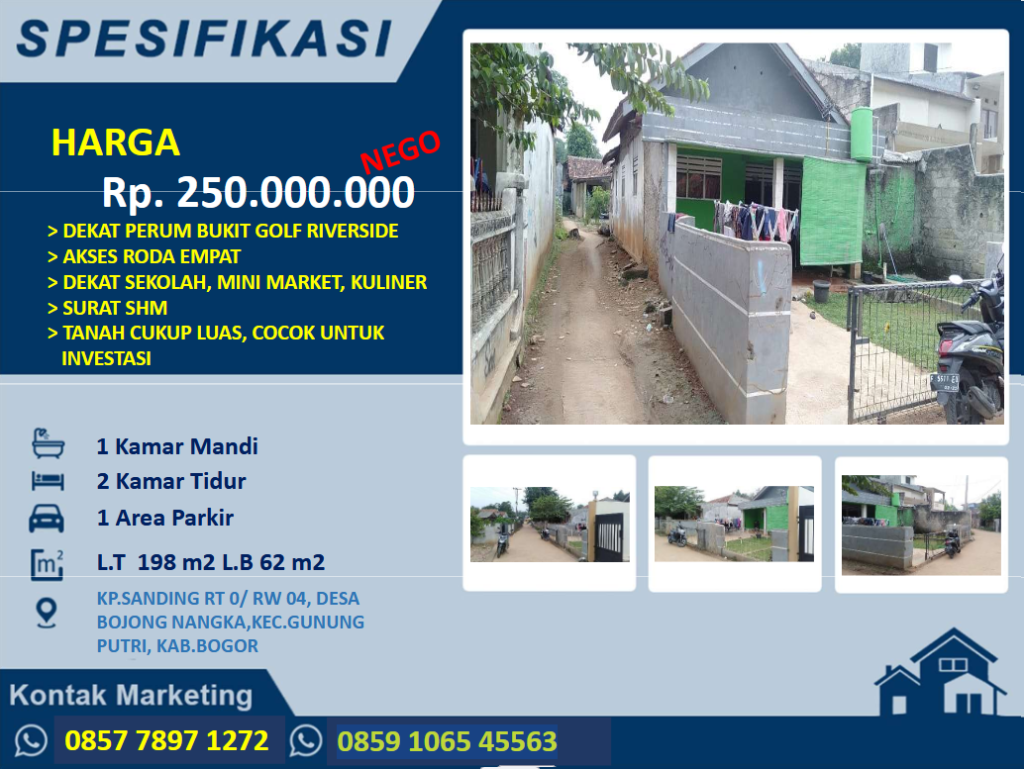 KP.SANDING RT 0/ RW 04, DESABOJONG NANGKA,KEC.GUNUNGPUTRI, KAB.BOGOR 1 Kamar Mandi2 Kamar Tidur1 Area ParkirL.T 198 m2 L.B 62 m2 HARGARp. 250.000.000 DEKAT PERUM BUKIT GOLF RIVERSIDEAKSES RODA EMPATDEKAT SEKOLAH, MINI MARKET, KULINERSURAT SHMTANAH CUKUP LUAS, COCOK UNTUKINVESTASI 0857 7897 1272 / 0859 1065 45563